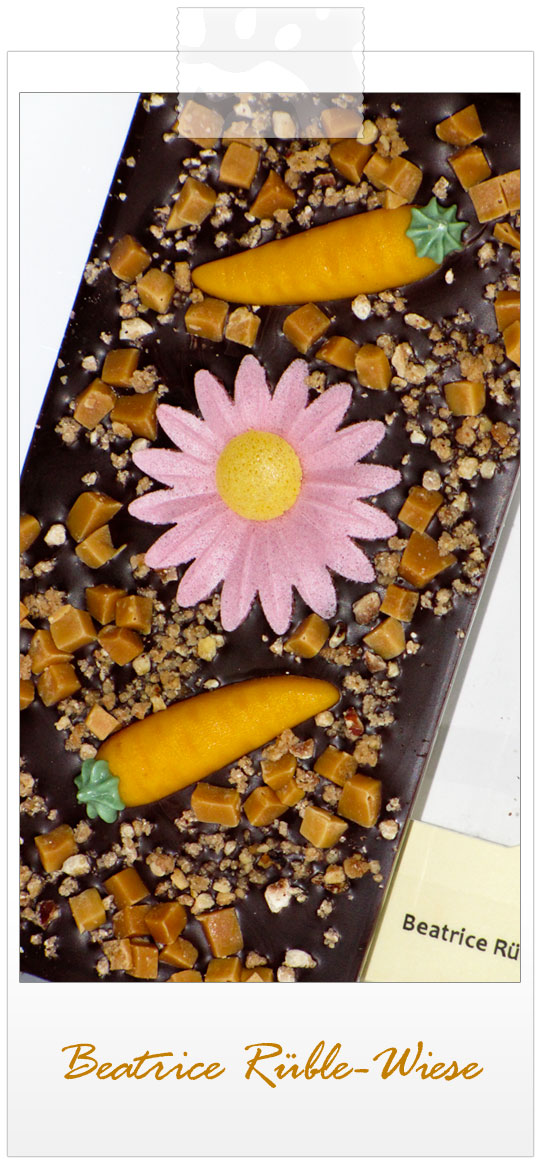 In einer zweiten Aktion konnte man sich noch entscheiden, ob man seine Schokolade in eine Spende umwandeln möchte. Ich habe mich für die Schokolade entschieden und so kann ich noch darüber berichten, wie es um die Schokolade steht, die ich bekommen habe. Meine Schoggi lief unter dem "Arbeitstitel" BEATRICE RÜBLI-WIESE :-): zartbitter Schokolade, Karamell, Krokant und Karamellstückchen, Marzipan-Rüblis und ein hübsches Blümchen. Ich habe ein herrliches Genusspaket bekommen. Wie schon oben geschrieben, wurde es mir noch vor Ostern überreicht. Die Wiese ist leider schon abgemäht - sie war lecker, lecker, lecker!