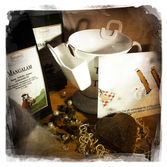 Zu sehen sind zwei spannende Teesorten, zwei Hängerchen für Tee-Müll - sie hängen nun an der Teetasse, die vom Pärchen übrig geblieben ist. So etwas kannte ich noch gar nicht - wie praktisch! Die Teestunden können nun mit einer duftenden Deko untermalt werden.. es duftet nach Nelken und Anis... herrlich, vorweihnachtlich!