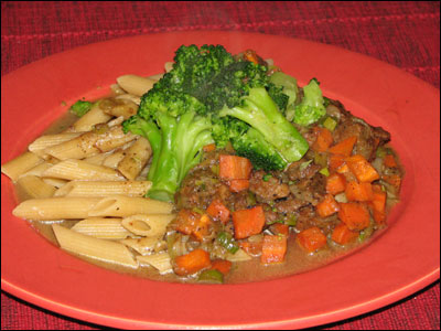 Hin und her geschoben habsch bei dem Gericht - 30 g mehr Fleisch als im Rezept angegeben, nur noch 20 g Kartoffelpüflocken in der Tüte, anstelle von 50 g... herrje..