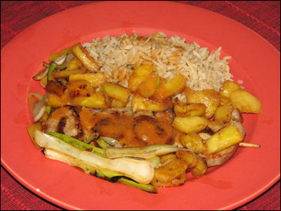 Aus Putenschnitzel mit Ananas und Currysoße hab ich Schweinefilet-Spiesschen mit Ananas und Currysoße gebrutzelt. 150 g Pute stand im Rezept und der Spieß hatte so um die 90g - na, da passt das schon und schlägt - wie auf dem Teller zu sehen - mit ca. 445 kcal zu Buche.