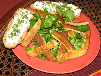 Abendessen: Gebratener Tofu auf Feldsalat (331kcal) inkl. Vollkornbrötchen. Tofu war für mich heute Premiere - Ein paar Stunden eingelegt in Sojasauce war der richtig lecker zum Salat. Beim Salat hätte ich wesentlich mehr nehmen dürfen, aber wohin damit, der Teller war sowieso schon voll ;-)