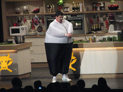 Die wohl witzigste Situation war, als er zwei Kiddies mitkochen liess. Der Junge probierte das Pesto, probierte von den handgequetschten Tomaten und ..... übergab sich auf die Bühne.
