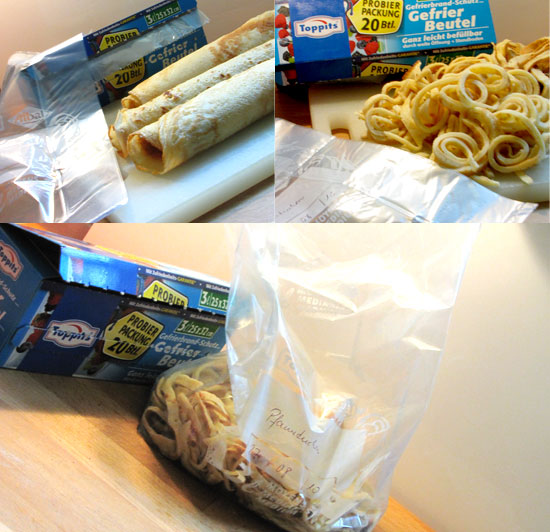 Heute sollten nun die Toppits-Gefrierbeutel ihre Überzeugungsarbeit leisten. Ich hatte ja noch einen kleinen Rest Pfannkuchen, den ich für eine Pfannkuchensuppe einfrieren wollte. Ich brauche oft nicht mehr zu Mittag als ein Süppchen und Pfannkuchensuppe ist mein großer Favorit.