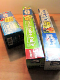 Die Toppits-Frischhaltefolie durfte die Testreihe eröffnen und gewann direkt mit einem bedeutenden Merkmal: sie ist ganze 3 cm breiter. 3 cm mehr Folie heißt, dass ein Teller (in Normalgrösse) komplett bedeckt werden kann. Bei anderen Folien ist es immer eine gezuppel oder es wird in Mehrfachlagen abgedeckt. So wird nichts gespart. Ein Ärgernis (für mich), das hier direkt aus der Welt geschaffen wurde. Einen weiteren, dicken Pluspunkt gibt es für die Abreiß-Säge. Die üblichen Papiersägen halten nicht wirklich lange und das Abreissen funktioniert nur noch mühsam. Fazit: Ich konnte also wunderbar einen Teller mit einem Rest Pfannkuchen abdecken und für den nächsten Tag aufbewahren. Echte Pfannkuchen-Fans, wie mein Herzblatt, mögen Pfannkuchen auch mal kalt und so waren am nächsten Tag drei oder vier Pfannkuchen weniger auf dem Teller zu finden.