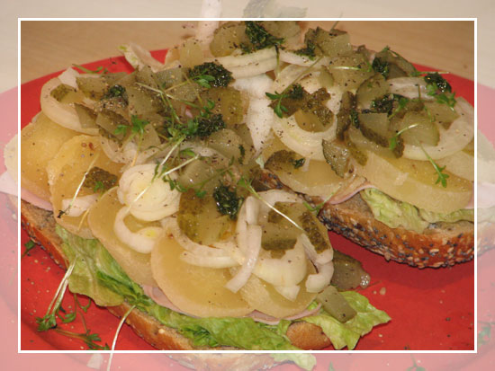 Das Dressing ist der Hit - zu gleichen Teilen Honig und Senf mischen, mit Pfeffer abschmecken- schmeckt sicher auch zu vielen anderen Sandwichs etc.