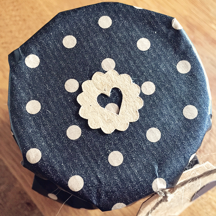 Das Geschenkpapier hab ich bei Tedi gefunden. Eine 6er-Packung mit 2x19cm-Rollen. Es macht sich bestens zur Apfel-Marzipan-Konfitüre. Aufkleber "Mit Liebe verpackt" findest du bei DEPOT.