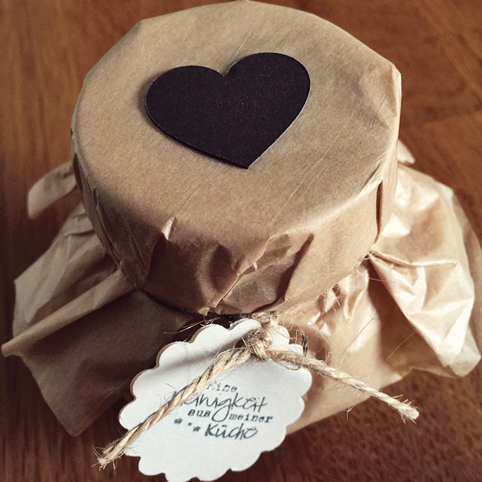 Ich verschenke gerne, was mir auch gut schmeckt und die erste Kochrunde war recht schnell weitergereicht. Die Fotos sind aus zwei Kochdurchgängen zusammengewürfelt ;-) Die Gläser hab ich mit Geschenkpapier und "Möbel-Schutzpapier" angehübscht.