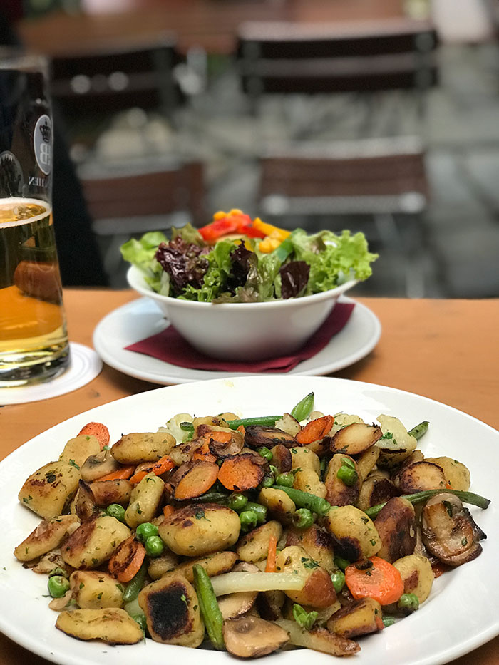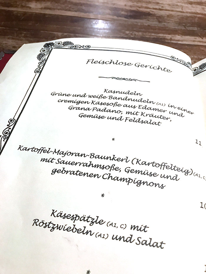 Und ein Blick in die Speisekarte. Ich entscheide mich natürlich für die Baunkerl. Eine niederbayerische Kartoffelspeise. A bisserl wie Gnocchi. Beim Hofreiter in einer gehobenen Version, mit dem Gemüse und Sauerrahm. Mega empfehlenswert.