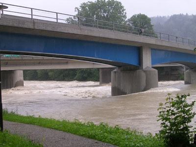 An der Staustufe wird fleissig Angeschwemmtes rausgebaggert, damit das Wasser ungehindert abfliessen kann.